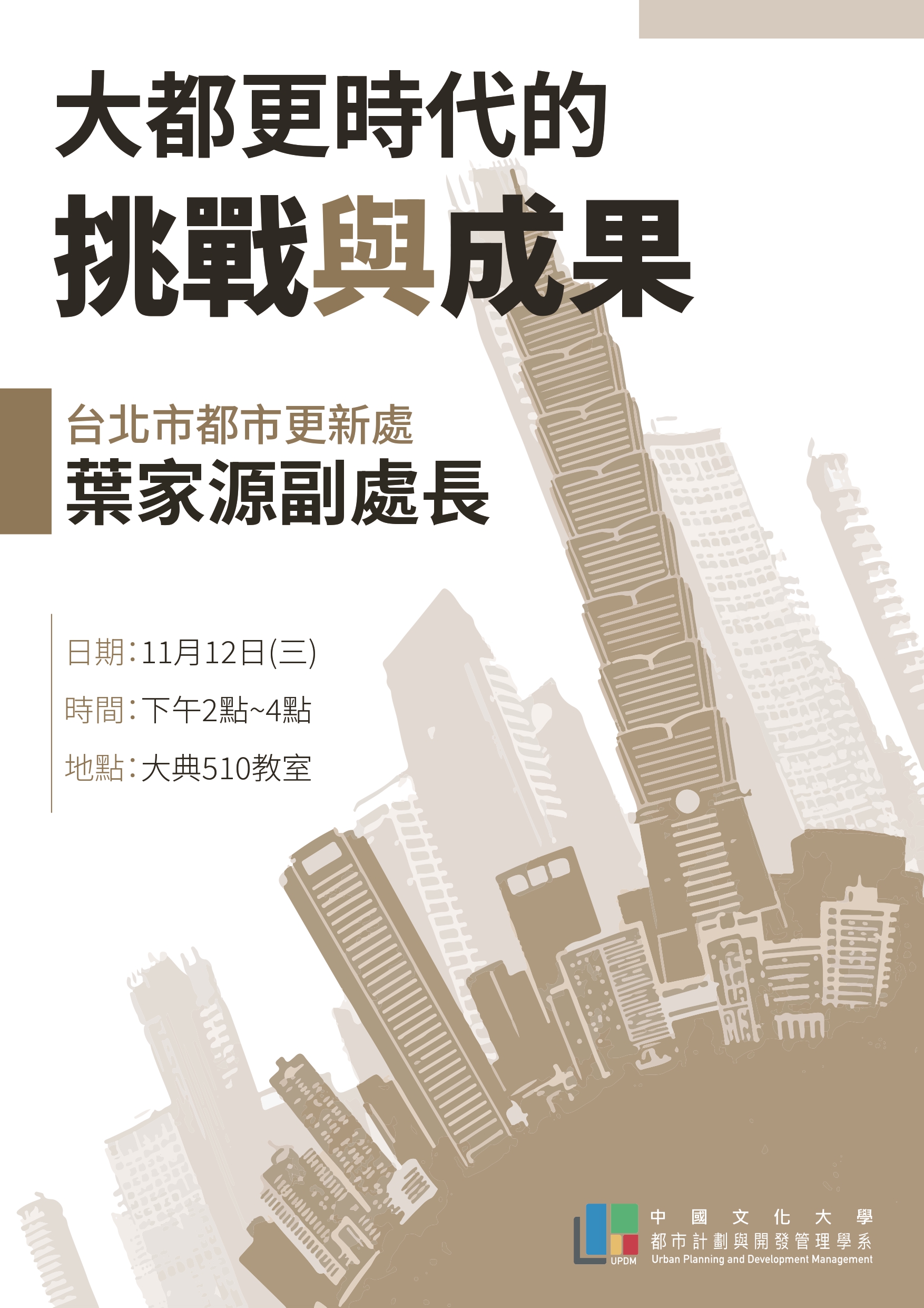 文化大學都市計劃與開發管理系邀請臺北市都市更新處——葉家源副處長演講「大都更時代的挑戰與成果」,與同學們分享臺北市都市更新歷程、現況與關鍵轉折。