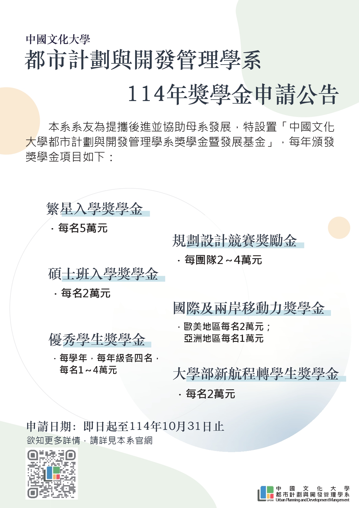 • 本系專屬獎學金開始申請!申請時間自即日起至10月31日止,獎學金項目如下: